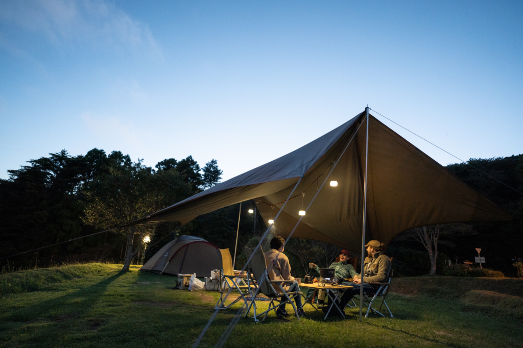 雄大な海と金華山が目の前に広がる絶好のロケーションでゆったりとした時間を過ごしていただくアウトドア体験。